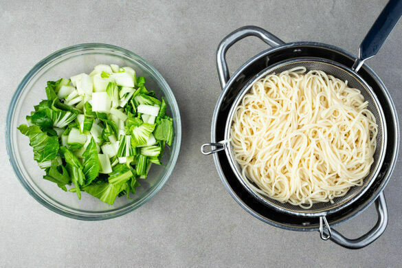 Die Nudeln in das kochende Wasser geben und in 4–6Min. bissfest kochen. Mit einer Tasse etwas Kochwasser abschöpfen, dann die Nudeln in Sieb abgießen, kalt abschrecken und abtropfen lassen. Den Pak Choi vom Strunk befreien, längs halbieren und in 1–2cm große Stücke schneiden.