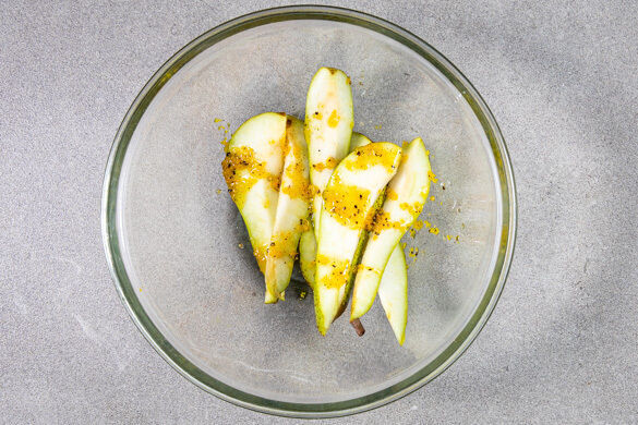 Die Orangenschale mit 2EL Olivenöl sowie je 1 kräftigen Prise Salz und Pfeffer zu einem Würzöl verrühren. Das Würzöl mit den Birnen vermengen.