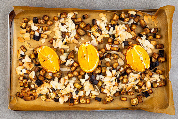 Die Mandelblättchen ca. 5Min. vor Ende der Backzeit über die Auberginen streuen und mitbacken. Einige Süßkartoffeln mit einer Gabel grob zerdrücken, um das Ragout anzudicken. Mit Salz, Pfeffer und Saft aus den gebackenen Orangenspalten abschmecken. Das Ragout mit den Auberginen anrichten, die Orangenspalten dazu reichen.