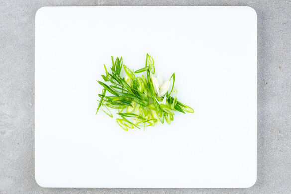 Die Lauchzwiebel schräg in feine Ringe schneiden. Die Nudeln mit der Sauce anrichten, mit den Lauchzwiebeln garnieren und servieren.