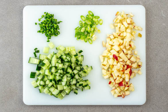 Den Apfel vierteln, entkernen und in kleine Würfel schneiden. Die Gurke ebenfalls fein würfeln. Die Lauchzwiebel in feine Ringe schneiden. Die Chilischote längs halbieren und fein würfeln, dabei ggf. für weniger Schärfe die Kerne entfernen.