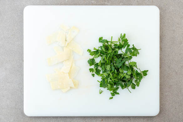 Den Käse mit einem Sparschäler in breite Streifen hobeln. Die Petersilie grob hacken. Den Käse und den Salat mit den Tomaten samt Marinade vermengen. Das Fleisch in Tranchen schneiden, mit der Sauce, den Kartoffeln und dem Käse-Tomaten-Salat anrichten und mit der Petersilie garniert servieren.
