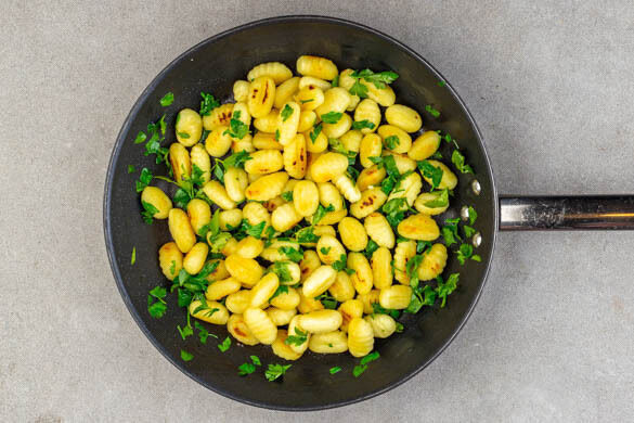 Die Gnocchi in einer großen Pfanne mit 3EL Olivenöl bei mittlerer Hitze ca. 7Min. braten, bis sie von allen Seiten knusprig und appetitlich gebräunt sind. Mit Salz und Pfeffer würzen und die Petersilie einrühren.