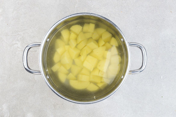 In einem mittelgroßen Topf ausreichend gesalzenes Wasser für die Kartoffeln zum Kochen bringen. Die Kartoffeln schälen und in 2–3cm große Stücke schneiden. In das kochende Wasser geben und in 15–20Min. gar kochen. In ein Sieb abgießen und abtropfen lassen, dann zurück in den Topf geben und warm halten.