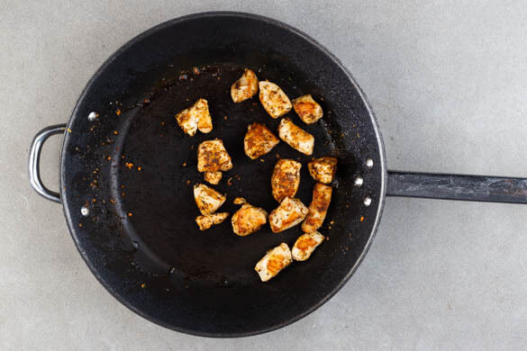 Das Fleisch trocken tupfen und in einer mittelgroßen Pfanne mit 2EL Olivenöl bei starker Hitze auf einer Seite ca. 2Min. goldbraun anbraten. Wenden und ca. 2Min. weiterbraten. Die Hitze reduzieren, die ½ der Gewürzmischung oder mehr untermengen und bei mittlerer bis niedriger Hitze rundum 1–2Min. braten, bis das Fleisch gar ist.