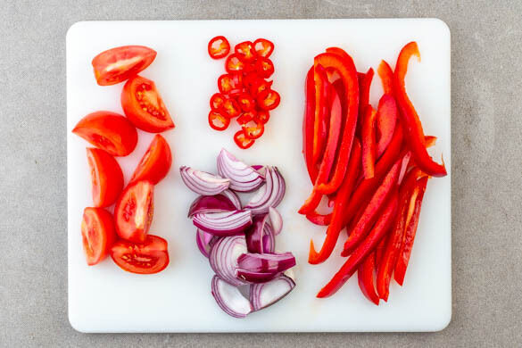 Inzwischen die Paprika vierteln, entkernen und in dünne Streifen schneiden. Die Tomaten vierteln. Die Zwiebeln schälen, halbieren und in feine Streifen schneiden. Die Peperoni in feine Ringe schneiden. Tipp: Für weniger Schärfe die Kerne entfernen.