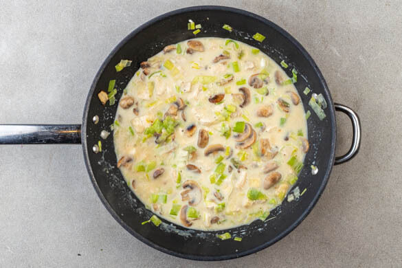 Die Hitze reduzieren und 2EL Butter, den Lauch und das Fleisch in die Pfanne geben und 3–5Min. mitbraten, bis der Lauch glasig und das Fleisch leicht weiß ist. Mit je 1TL Salz und Pfeffer würzen.