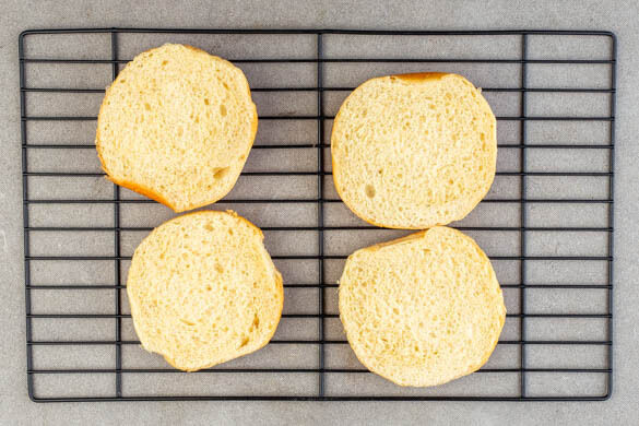 Die Brötchen aufschneiden und auf einen Backrost geben. Das Backblech und den Backrost in den Ofen schieben und ca. 2Min. backen, bis die Brötchen knusprig und die Süßkartoffeln weich sind.