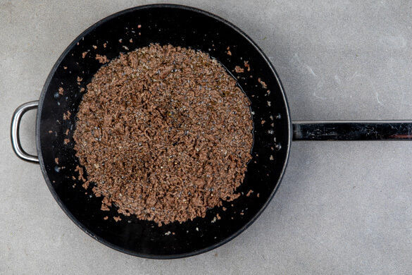 Das Hackfleisch mit der Würzpaste vermengen und in einer großen Pfanne oder einem Wok bei mittlerer bis starker Hitze 8–10Min. anbraten, bis es appetitlich gebräunt und an den Rändern leicht knusprig ist. Mit Salz und Pfeffer nach Geschmack würzen.