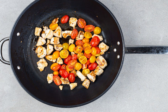 Das Fleisch in der Pfanne bei starker Hitze 2–3Min. scharf anbraten. Nach Belieben erneut mit Salz und Pfeffer würzen, dann die Tomaten dazugeben und 1–2Min. bei mittlerer Hitze mitbraten.