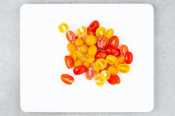 Die Tomaten halbieren. Die Pasta in das kochende Wasser geben und in 7–9Min. bissfest kochen. Mit einem Messbecher ca. 150ml Pastawasser abschöpfen, dann die Pasta in ein Sieb abgießen, zurück in den Topf geben und warm halten.