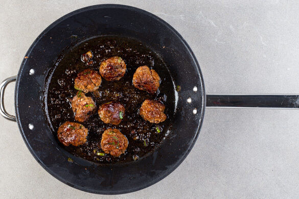 Das Hackfleisch mit dem Knoblauch, den Lauchzwiebeln, 2TL Honig sowie je ½TL Salz und Pfeffer gut verkneten. 18–21 gleich große Kugeln formen, diese leicht platt drücken und ggf. in zwei Durchgängen in einer großen Pfanne mit 3EL Pflanzenöl bei mittlerer Hitze auf jeder Seite 2–3Min. anbraten. Das Ketjap Manis unterrühren und die Pfanne beiseitstellen.