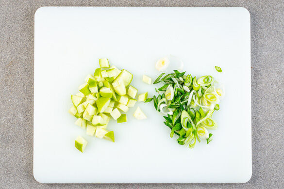 Die übrigen Apfelviertel in ca. 1cm große Stücke schneiden. Die Lauchzwiebel in feine Ringe schneiden.