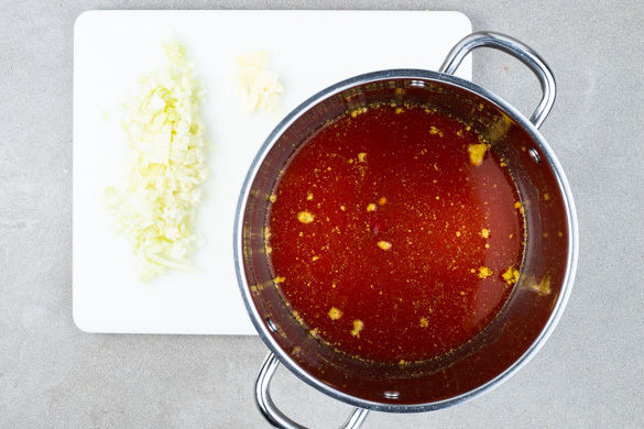 Den Backofen auf 160°C Umluft (180°C Ober-/Unterhitze) vorheizen. In einem mittelgroßen Topf 1L Wasser mit 1 1/2 Dosen Tomatenmark und dem Brühgewürz aufkochen. Das restliche Tomatenmark wird für dieses Rezept nicht benötigt. Die Zwiebel schälen, halbieren und in feine Würfel schneiden. Den Knoblauch schälen und in feine Scheibchen schneiden.