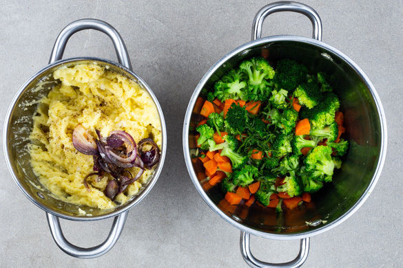 In einem weiteren mittelgroßen Topf ausreichend gesalzenes Wasser zum Kochen bringen. Den Brokkoli und die Karotten im kochenden Wasser in 3–4Min bissfest kochen. In ein Sieb abgießen, zurück in den Topf geben und abgedeckt warm halten.