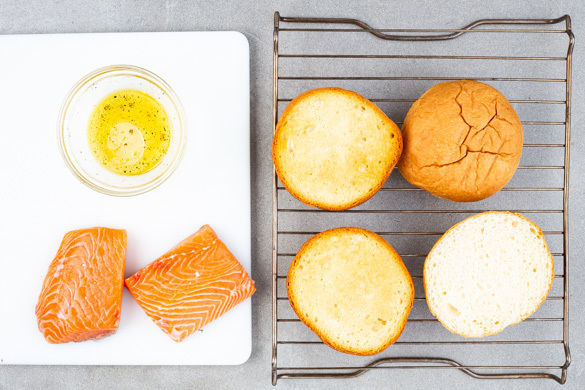 Die Burgerbrötchen aufschneiden und ca. 5Min. im Ofen aufbacken. Aus 2EL Olivenöl, 2EL Essig, dem restlichen Zitronenabrieb, 1/2–1TL Zucker sowie Salz und Pfeffer ein Dressing anrühren. Den Lachs mit kaltem Wasser abspülen, trocken tupfen und ggf. in 2 gleich große Stücke schneiden und von der Haut befreien.