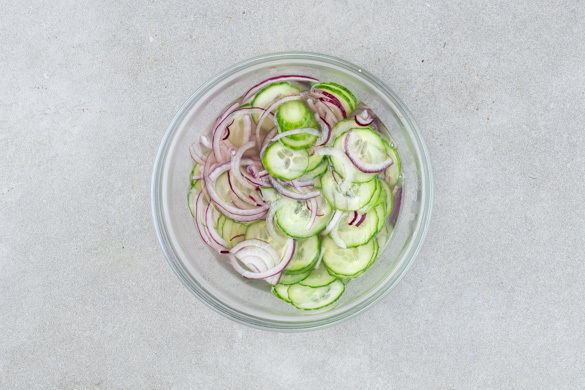 Die Gurken und die Zwiebelstreifen mit 50ml heißem Wasser, 1EL Essig und 1TL Zucker vermengen und ziehen lassen.