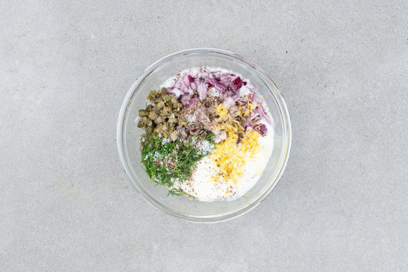 Die Kapern fein hacken. Die Dillspitzen abzupfen und grob schneiden. Den Joghurt mit der Mayonnaise, den restlichen Zwiebeln, den Kapern und dem Dill verrühren. Die Remoulade mit 1/2TL Zitronenschale sowie Salz und Pfeffer abschmecken.