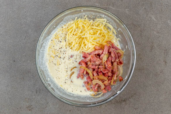 Die Crème fraîche mit 200ml Milch und 2 Eiern verquirlen, dann die Speck-Zwiebel-Mischung und den Käse untermischen und mit je 1 kräftigen Prise Salz und Pfeffer würzen. Vorsicht, der Speck und der Käse sind auch schon salzig.