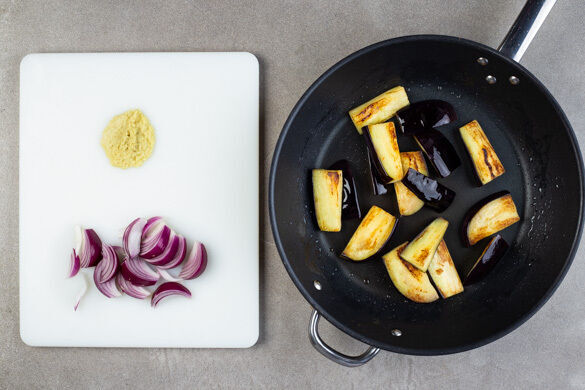 Den Backofen auf 200°C (180°C Umluft) vorheizen. Die Zwiebel schälen, halbieren und in feine Streifen schneiden. Die Aubergine erst quer dann längs halbieren, in ca. 2cm breite Streifen schneiden und in einer großen Pfanne mit 1EL Pflanzenöl und 1 kräftigen Prise Salz bei starker Hitze 4–6Min. goldbraun und weich braten, dann aus der Pfanne nehmen. Den Ingwer schälen und fein würfeln.