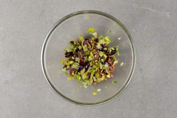 Die Oliven mit dem gehackten Lauch und 2EL Olivenöl vermengen und die Gremolata mit der Orangenschale und je 1 Prise Salz und Pfeffer abschmecken.