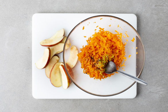 Die Karotten ggf. schälen und grob raspeln. Die Zitronenschale fein abreiben, dann die Zitrone halbieren und auspressen. 2EL Zitronensaft und 1TL -schale mit 2EL Olivenöl sowie Salz und Pfeffer nach Geschmack unter die Karotten mischen. Die Äpfel vierteln, entkernen, in dünne Scheiben schneiden und ebenfalls untermischen. Ggf. mit mehr Zitronenschale nachwürzen.