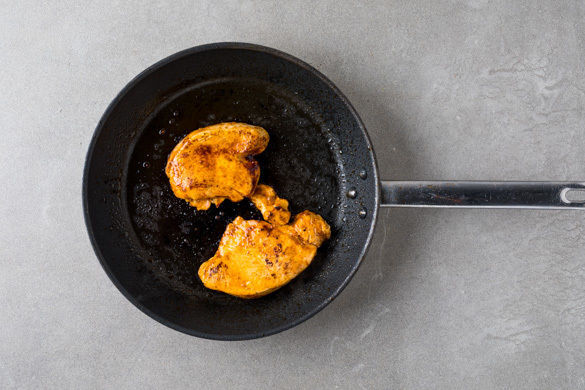 Eine große Pfanne stark erhitzen und das Fleisch in der heißen Pfanne auf jeder Seite 3–5Min. braten, bis es goldbraun und gar ist. Mit Salz und Pfeffer würzen und auf einem Teller ca. 5Min. abgedeckt ruhen lassen. Die Pfanne wird weiterverwendet.