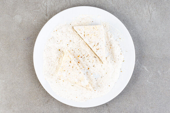 Währenddessen auf einem großen Teller 2EL Mehl mit der restlichen Gewürzmischung vermengen. Den Käse diagonal durchschneiden und in der Mehlmischung wenden, bis er rundum gleichmäßig und dünn bedeckt ist.