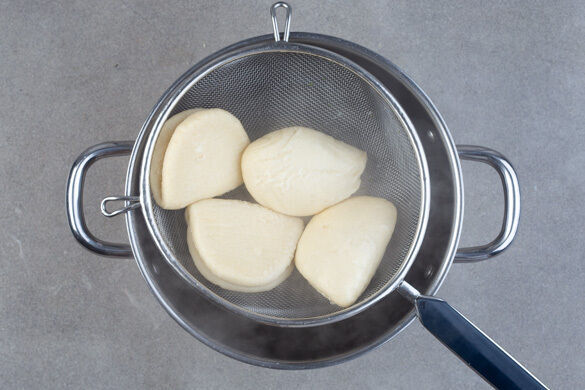 Ein sauberes Küchentuch vorsichtig gut mit heißem Wasser anfeuchten und die Hefebrötchen darin einwickeln. In eine mikrowelleengeignete Schüssel geben und abgedeckt in der Mikrowelle bei 700W in 90Sek. vollständig erwärmen. Währenddessen die Erdnüsse grob hacken.