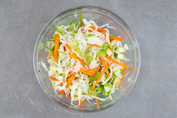 Die Karotte ggf. schälen und grob raspeln. Den Apfel vierteln, entkernen und ebenfalls grob raspeln. Die Karotten- und Apfelraspel mit dem Weißkohl in das Dressing geben und 1–2Min. gut durchkneten, bis das Gemüse weich wird. Zum Schluss die Lauchzwiebel in feine Ringe schneiden und unterheben.
