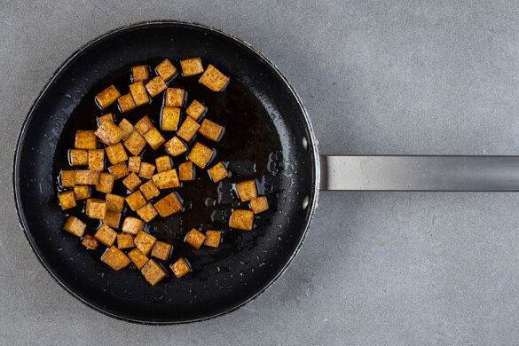 In einer mittelgroßen Pfanne 1EL Pflanzenöl bei mittlerer bis starker Hitze erwärmen. Den Tofu in das heiße Öl geben und in ca. 5Min. rundum goldbraun braten.