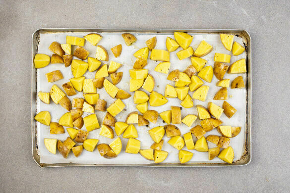 Den Backofen auf 240°C (220°C Umluft) vorheizen. Die Kartoffeln samt Schale würfeln, auf einem mit Backpapier ausgelegten Backblech mit 2EL Olivenöl vermengen und mit Salz würzen, ggf. ein zweites Blech verwenden. Im Ofen in 20–25Min. goldbraun backen, nach der Hälfte der Zeit wenden und ggf. die Bleche tauschen.