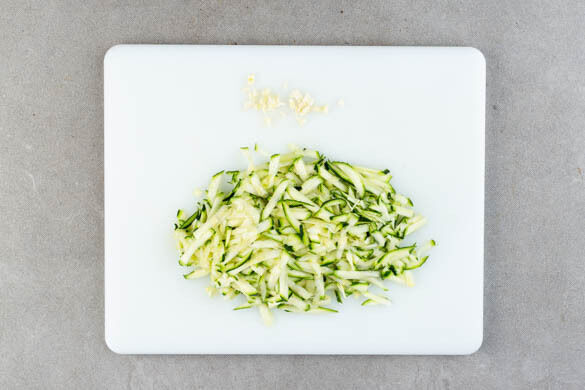 Die Zucchini grob reiben. Den Knoblauch schälen und fein würfeln.