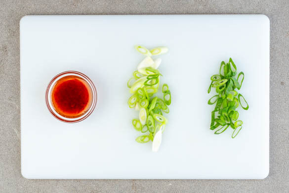 In einem großen Topf ausreichend gesalzenes Wasser für die Nudeln zum Kochen bringen. Das Sesamöl mit 2TL Sambal Badjak verrühren und mit 1 Prise Salz würzen. Die Lauchzwiebeln schräg in feine Ringe schneiden, den weißen und grünen Teil getrennt voneinander aufbewahren.