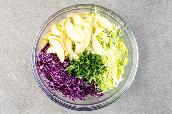 Den Eisbergsalat und den Rotkohl in feine Streifen schneiden, dabei den Strunk entfernen. Den Apfel vierteln, entkernen und in dünne Scheiben schneiden. Den Koriander samt Stängeln grob schneiden. Den Eisbergsalat und den Rotkohl mit den Apfelscheiben und ⅔ des Korianders vermengen.