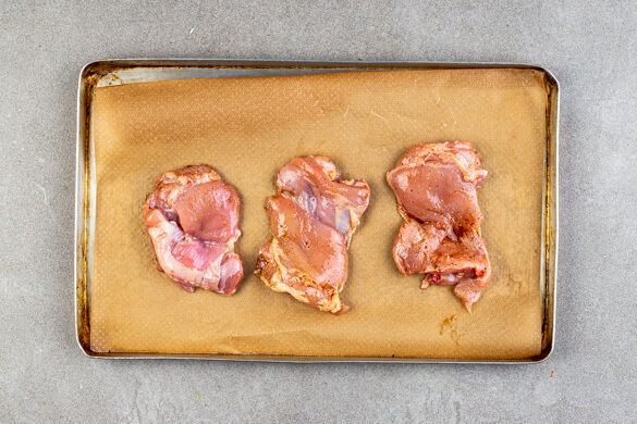 Den Backofen auf 220°C Umluft (240°C Ober-/Unterhitze) vorheizen. Das Fleisch trocken tupfen und auf einem mit Backpapier ausgelegten Backblech mit 1EL Pflanzenöl, der ½ der Gewürzmischung und je 1 Prise Salz und Pfeffer einreiben. Im Ofen 15–20Min. backen, bis das Fleisch knusprig und gar ist.