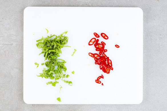 Die Basilikumblätter abzupfen und in feine Streifen schneiden. Die Peperoni in dünne Ringe schneiden. Tipp: Für weniger Schärfe die Kerne entfernen.