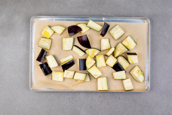 Den Backofen mit Grillfunktion oder Ober-/Unterhitze auf 250°C vorheizen. Die Aubergine je nach Größe der Länge nach vierteln oder sechsteln und jedes Stück quer in 2–2,5cm große Würfel schneiden.