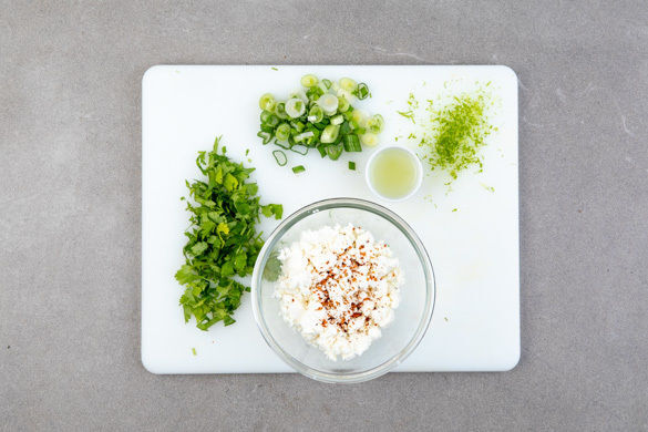 Den Koriander samt Stängeln grob schneiden. Die Lauchzwiebel in feine Ringe schneiden. Die Limettenschale abreiben, dann die Limette halbieren und auspressen. Den Feta mit den Fingern oder einer Gabel zerkrümeln und mit dem Koriander, den Lauchzwiebeln, 1TL Limettenschale und 1EL Limettensaft vermengen. Mit 1 Prise Gewürzmischung abschmecken.