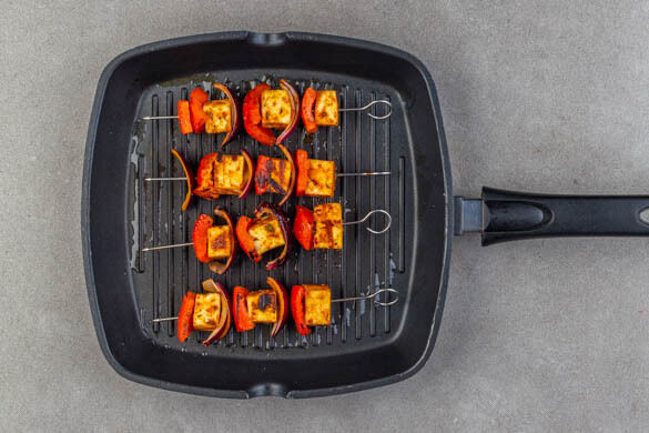Die Spieße auf dem Grill oder in der Grillpfanne rundum 6–8Min. grillen oder bis das Gemüse gar ist. Vorsicht: Darauf achten, dass der Paneer nicht zu dunkel wird.