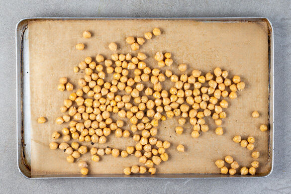 Den Backofen auf 220°C (200°C Umluft) vorheizen. Die Kichererbsen in einem Sieb mit kaltem Wasser abspülen, abtropfen lassen und möglichst gut trocken tupfen. Dann mit 1EL Olivenöl sowie je 1 Prise Salz und Pfeffer vermengen, auf einem mit Backpapier ausgelegten Backblech verteilen und 12–15Min. im Ofen rösten, bis sie knusprig sind.