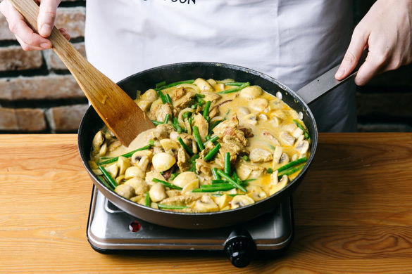 Mit der Kokosmilch und 50ml Wasser ablöschen und das Brühgewürz unterrühren. Mit Salz und Pfeffer abschmecken und das Hähnchencurry auf niedriger Hitze noch 5–6Min. sanft köcheln lassen. Das Curry mit den Nudeln anrichten und servieren.