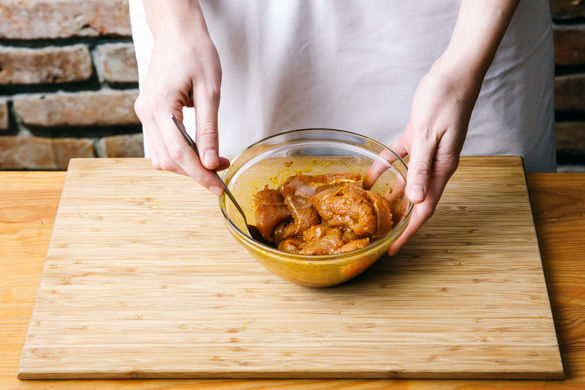 In einem mittelgroßen Topf ausreichend gesalzenes Wasser für die Nudeln zum Kochen bringen. Das Fleisch mit etwas Küchenkrepp trocken tupfen, in ca. 1cm dünne Streifen schneiden und mit der 1/2 der Currypaste oder mehr und 1EL Pflanzenöl vermengen.