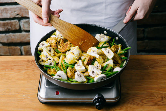 Das Fleisch in einer großen Pfanne bei starker Hitze 1–2Min. scharf anbraten. Die Zwiebeln, die Bohnen und die Pilze hinzugeben und 1–2Min. mitbraten.