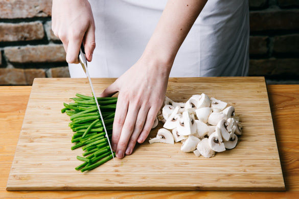 Die Enden der Bohnen entfernen und die Bohnen quer halbieren. Die Champignons ggf. mit etwas Küchenkrepp oder einer Bürste säubern und je nach Größe vierteln oder achteln.