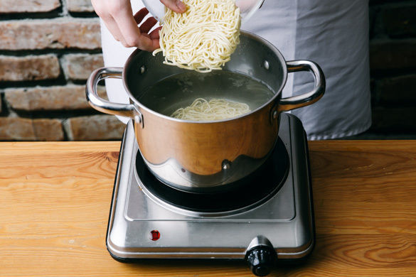 Die Nudeln in das kochende Wasser geben und in 3–5Min. bissfest kochen. In ein Sieb abgießen, kalt abschrecken und abtropfen lassen, dann zurück in den Topf geben und warm halten.