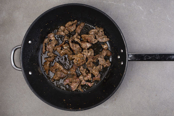 Das Fleisch in einer großen Pfanne bei starker Hitze ca. 2Min. scharf anbraten, dann auf einen Teller geben. Die Pfanne abkühlen lassen und mit Küchenkrepp auswischen. Die Basilikumblätter von den Stängeln zupfen.