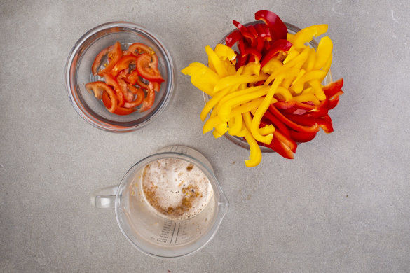 Die Tomaten vierteln, den Strunk entfernen und das Kerngehäuse herausschneiden. Das Kerngehäuse der Tomaten in einem hohen Gefäß mit einem Stabmixer pürieren und mit Salz und Pfeffer würzen. Das Tomatenfruchtfleisch in Streifen schneiden. Die Paprika halbieren, entkernen und in lange, dünne Streifen schneiden.