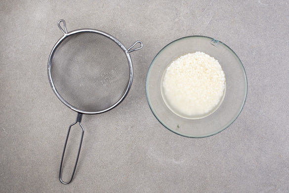 Den Backofen auf 180°C Umluft (200°C Ober-/Unterhitze) vorheizen. Den Reis 5Min. in warmem Wasser einweichen, dann in einem Sieb unter fließendem Wasser abspülen, bis das ablaufende Wasser klar bleibt.