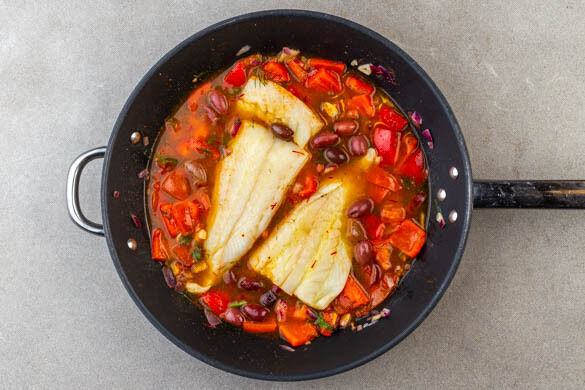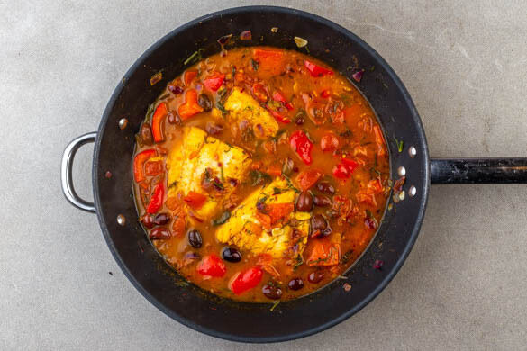 Das Safranwasser über den Fisch und dem Gemüse gießen und die Oliven auf dem Fisch und dem Gemüse verteilen. Einmal aufkochen lassen, dann abgedeckt bei niedrigster Hitze ca. 10Min. sanft köcheln lassen. Dabei nach 5Min. und am Ende der Kochzeit mit einem Löffel etwas Kochflüssigkeit über den Fisch träufeln.